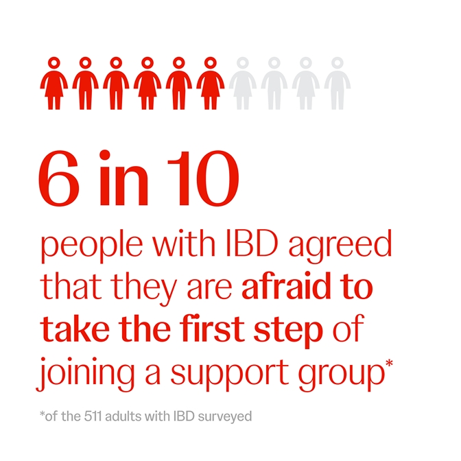 According to the survey, six in 10 people with IBD (60%) agreed that they are afraid to take the first step of joining a support group. Among the one in seven (14%) who have not engaged with the IBD community, concerns over privacy (34%) and difficulty or embarrassment over talking about IBD (31%) are the most common barriers cited. §