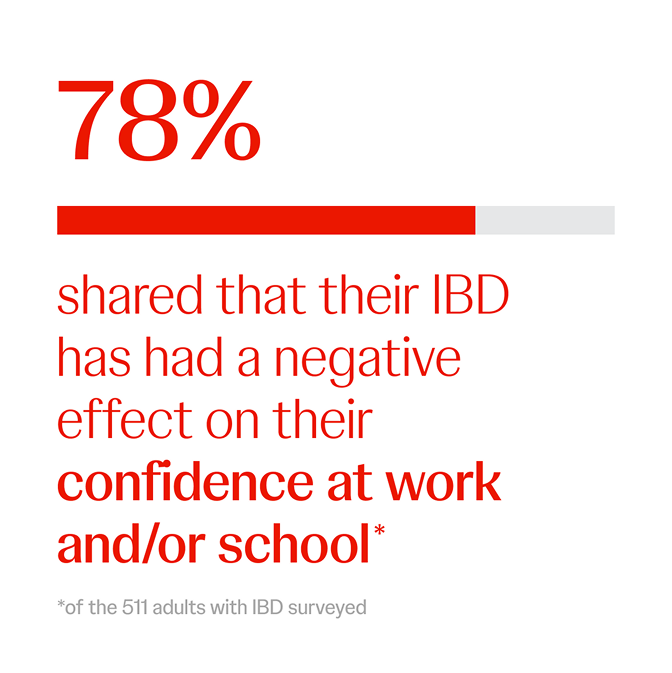 functional impairment for almost half of their total working time.24 Additionally, in the survey, 78% of people with IBD shared that their IBD has had a negative effect on their confidence at work and/or school, with younger people with IBD more likely to feel the negative impact compared to their older counterparts.‡