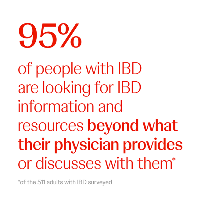 Despite the challenges faced by people living with the disease, people with IBD overwhelmingly seek out IBD information, resources, and a sense of community and support that extends well beyond what they can get from their HCPs. In fact, people who have engaged