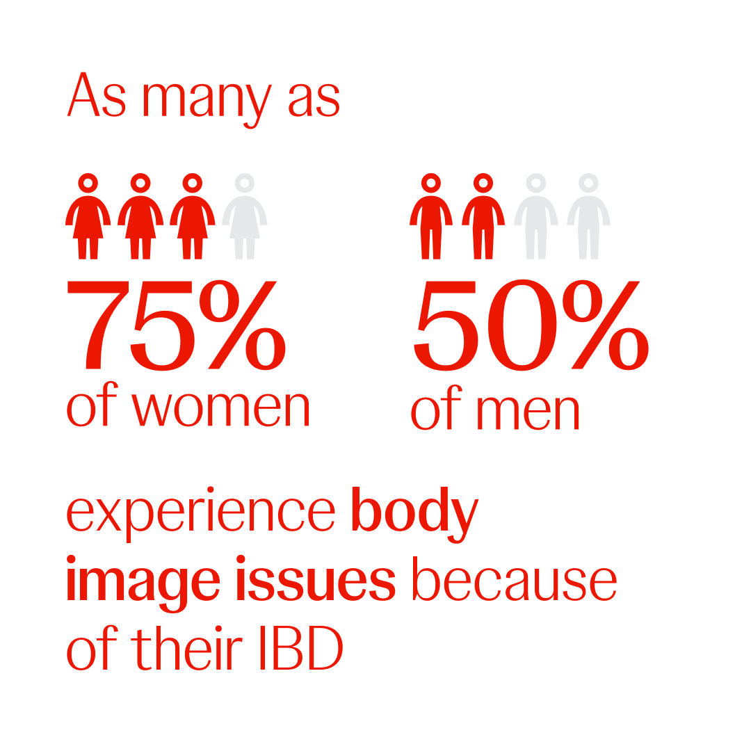 bags, fistulae, skin manifestations of the disease, and more, can also affect dating and relationships. As many as 75% of women and 50% of men experience body image issues because of their IBD.44