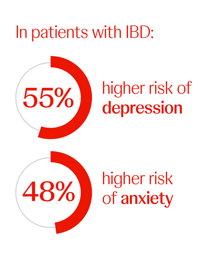 psychological conditions in people with IBD are depression and anxiety—with as many as 40% and up to 30%, respectively, experiencing these comorbidities—and some experiencing one or both, even in remission.26,27