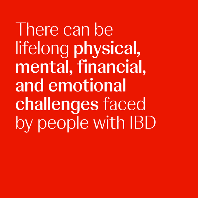 There can also be lifelong physical, mental, financial, and emotional challenges faced by people with IBD, as well as a different degree of medical trauma, since disease monitoring and treatment often require invasive measures like colonoscopy, and frequent (and sometimes uncomfortable) testing and medical visits.5,8,16 As a result, the physical symptoms and psychosocial burdens contribute to ongoing isolation and stigma19—making community support critical.